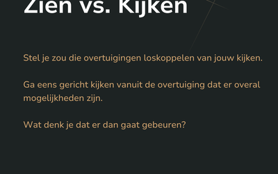 Eigenlijk zou je hem ook uit een kunnen zetten als bewust vs. onbewust. Iets vliegt aan je voorbij, en je ziet het voorbij komen. Of je kijkt ergens bewust naar, observeert het, en vanuit die observatie zie je iets ontvouwen.Een mooi verschil is het volgende: Je gaat naar de autodealer en koopt daar je allereerste auto, een prachtige rode Ford Fiesta (voor degenen die mij kennen 😛). Je haalt de auto op bij de dealer en gaat hem goed gebruiken de komende jaren.De volgende keer dat je weer over straat gaat of in de auto stapt, zie je ineens overal rode Ford Fiesta’s voorbijkomen. Je vraagt jezelf af: ben ik nou gek, of heeft de helft van Nederland afgelopen week ineens een rode Ford Fiesta gekocht?Dit noemen we selectieve waarneming: je kijkt veel gerichter naar de wereld om je heen, en die rode Ford Fiesta verwacht je te zien.Op het moment dat je naar de wereld gaat 'kijken' vanuit overtuigingen, ziet de wereld er heel anders uit. Die overtuigingen vullen je selectieve waarnemingen.Zie deze dingen niet gewoon aan je voorbijkomen, maar sta er eens bij stil en kijk ernaar. Is ditgene wat mij overkomt of waar ik naar kijk iets wat zich creëert vanuit een overtuiging, of is dit daadwerkelijk de context?Voorbeeld: Stel dat je ervan overtuigd bent dat je altijd ongeluk hebt in je leven; dan zul je hier bevestiging voor gaan zoeken om deze overtuiging daarmee te voeden. Zo houd je de overtuiging die je hebt in stand en kijk je gericht naar de wereld om je heen om dit te bevestigen.Stel je zou die overtuigingen loskoppelen van jouw kijken. Ga eens gericht kijken vanuit de overtuiging dat er overal mogelijkheden zijn. Wat denk je dat er dan gaat gebeuren?Laat ik deze uiteenzetting eens afbreken naar een praktische tool die je in je dagelijks leven zou kunnen gebruiken.Simpel gezegd wil je door 3 verschillende fases heen:Zien ---> Kijken ---> Corrigeren ---> Opnieuw kijken en vervolgens opnieuw corrigerenStap 1: Om van een staat van zien naar een staat van kijken te komen, zul je moeten vertragen. Stel jezelf bijvoorbeeld de volgende vraag:Welke overtuigingen heb ik die mij belemmeren in het behalen van mijn doelen?Stap 2: Vanuit een staat van kijken correcties gaan toepassen.De vraag die je jezelf hier zou kunnen stellen is:Bij welke acties die ik dagelijks doe beperkt deze overtuiging mij?Stap 3: Corrigeren.Welke mogelijkheden zie ik voor mezelf als ik deze overtuiging zou laten voor wat het is en hem mijn kijken niet meer zou laten beperken?"