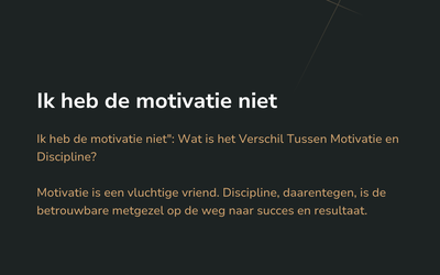"Ik heb de motivatie niet": Wat is het Verschil Tussen Motivatie en Discipline?Motivatie is een vluchtige vriend. Discipline, daarentegen, is de betrouwbare metgezel op de weg naar succes en resultaat.Wachten op motivatie is als wachten op een bus die misschien nooit komt. Discipline wacht niet, maar begint te lopen.Het geheim? Starten, ongeacht je wel of niet gemotiveerd bent. Discipline voedt zichzelf; actie creëert motivatie, niet andersom.Zelfs de meest gedisciplineerde mensen hebben dagen zonder motivatie. Het verschil? Ze handelen, ongeacht het gevoel.Discipline is een gewoonte, niet afhankelijk van stemmingen. Het is de consistente inzet die successen voortbrengt.Dus, als je weer een keer de interne dialoog ervaart "Ik heb de motivatie niet," vergeet dan niet: discipline is de sleutel. Start klein, bouw gewoontes, en groei.