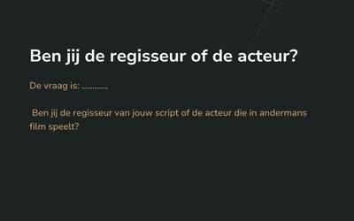 Ben jij de regisseur of de acteur?De vraag is: ............Ben jij de regisseur van jouw script of de acteur die in andermans film speelt?Elke keuze die we maken, elk woord dat we uitspreken, vormt het script van ons bestaan.Als regisseur bepaal jij de richting en schrijf jij het script. Kies dus zorgvuldig hoe het script eruit komt te zien.Realiseer je goed dat de camera altijd draait. (Af en toe vertragen doet wonderen)Misschien ben je gewend de rol van acteur op je te nemen, te reageren op de regie van anderen. Maar wat zou er gebeuren als je zelf het script zou schrijven?Acteurs ondergaan het verhaal, regisseurs creëren het. Maak van jouw leven een film die onvergetelijk is voor je omgeving en je familie.Accepteer geen bijrol in iemand anders' script.Regisseer de scènes van jouw succes, stuur de dialogen. Het leven is jouw filmset, dus neem de regie.Elke dag is een nieuwe opname dag, weer een mogelijkheid om zelf het beeldmateriaal te creëren voor jou kaskraker.Het script ligt open. Wat wordt de volgende scène? Jij hebt de pen, de regie, de macht. Ben jij de regisseur of de acteur in jouw levensverhaal?De keuze is aan jou. Regisseren of acteren? Zeg het maar...
