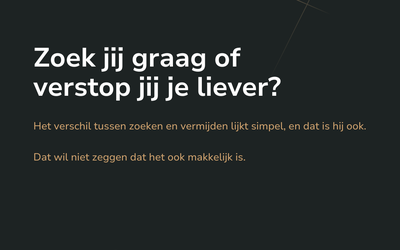 Het verschil tussen zoeken en vermijden lijkt simpel, en dat is hij ook! Of 🤔 Dat wil niet zeggen dat het ook makkelijk is. Bepaalde situaties in het leven wil je echt vermijden, deze brengen je niet verder. Als je er even over nadenkt weet je precies welke ik bedoel. Voor mij was dit ook heel erg helder toen ik hier mee geconfronteerd werd. Ik had een confrontatie met mijn eigen acties aan te gaan. Noodzakelijke acties werden aan de kant geschoven voor comfort. Ik was mij letterlijk aan het verstoppen achter andere zogenaamde belangrijke acties. Dit is exact wat ik om mij heen ook zie gebeuren, ik zie heel vaak mensen noodzakelijke acties uit de weg gaan. Terwijl je daar juist de mogelijkheden moet zoeken of het resultaat. Zoek de confrontatie met jezelf op, verstop je niet in comfortabele acties. En comfortabel is het zeker niet maar vermijden help je niet verder. Vermijden en comfort gaan in dat opzicht erg goed met elkaar. “Als ik er maar niet naar kijk dan is het er ook niet en hoef ik er niks mee te doen”. Juist dat wat je vermijdt moet je gaan opzoeken. Wat is hetgeen wat ik eigenlijk vermijd? Angst, verantwoordelijkheid of confrontatie? Maar zoals eerder al aangegeven, sommige zaken kun je beter vermijden maar ik hoef jou niet te vertellen welke dat zijn. Mensen weten heel er goed wat wel en wat niet te doen. Hoeveel noodzakelijke acties ga jij uit de weg?
